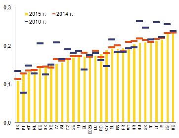 4.3.2.Относително разсейване на равнищата на заетост по образователна степен, 2010 г., 2014 г. и 2015 г.34