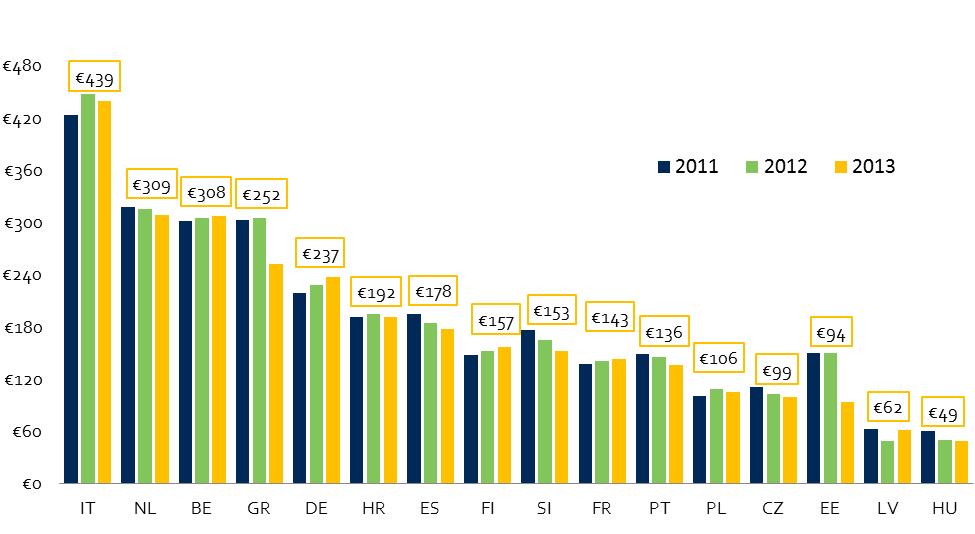 Доклад на Insurance Europe относно европейските пазари за автомобилно застраховане, стр. 40 (графика 48), ноември 2015 г. ( www.insuranceeurope.eu ). Следва да се има предвид, че графиката е актуализирана, за да не включва държави извън ЕС. Вж. също Проучване на Europe Economics относно пазара на застраховането на дребно (26.11.2009 г.), стр. 301 и 315 ( http://ec.europa.eu/finance/insurance/docs/motor/20100302rim_en.pdf ).