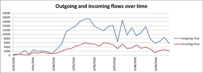 Графика 1: Тенденции по отношение на мигрантите, заминаващи от Нигер и пристигащи в Нигер (източник: Международна организация по миграция)