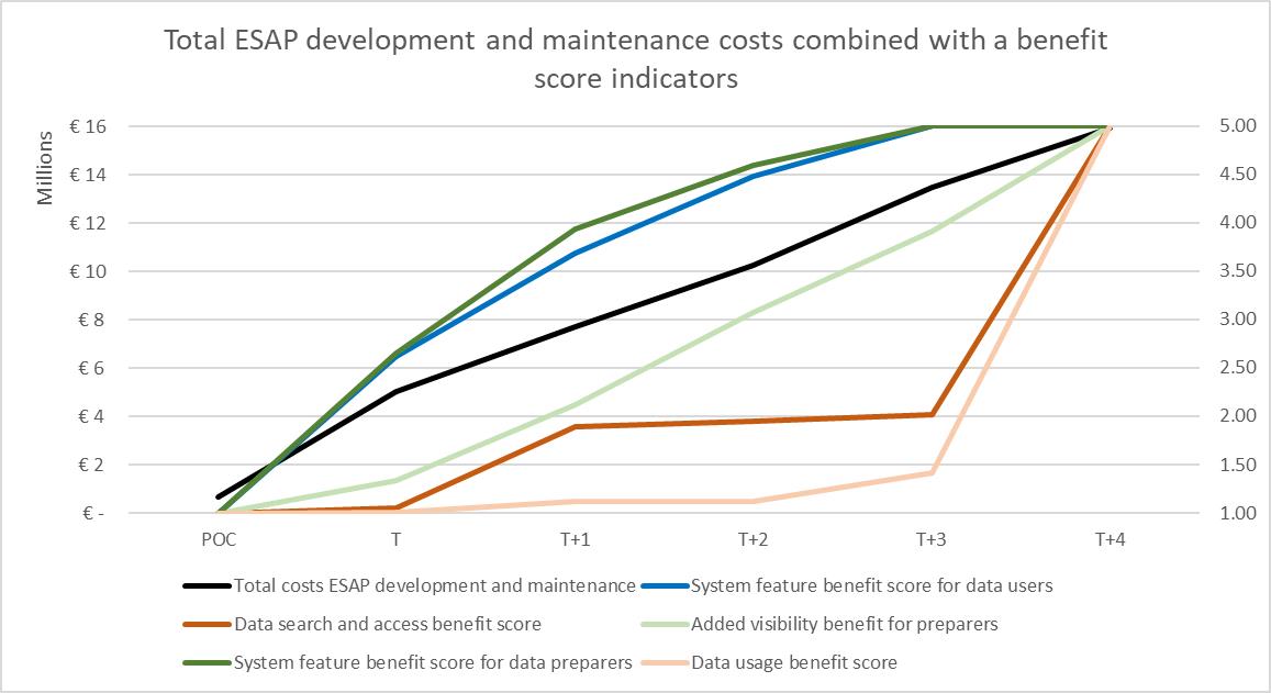 Both data preparers and users benefit from the system since its launch and the benefits seem to grow in a higher pace than the total costs, which is a good indicator of the systems’ usefulness. The benefits for the data users on the data search, data access and usage side, however, seem to grow a bit slower as the bulk of the data contents is to be included in the scope of ESAP at the phase T+4. Similarly, for the data preparers the benefit of added visibility rises slightly slower in relation to the total costs, as less data and relatively narrow data scope might attract less data users to the system in its first phases.