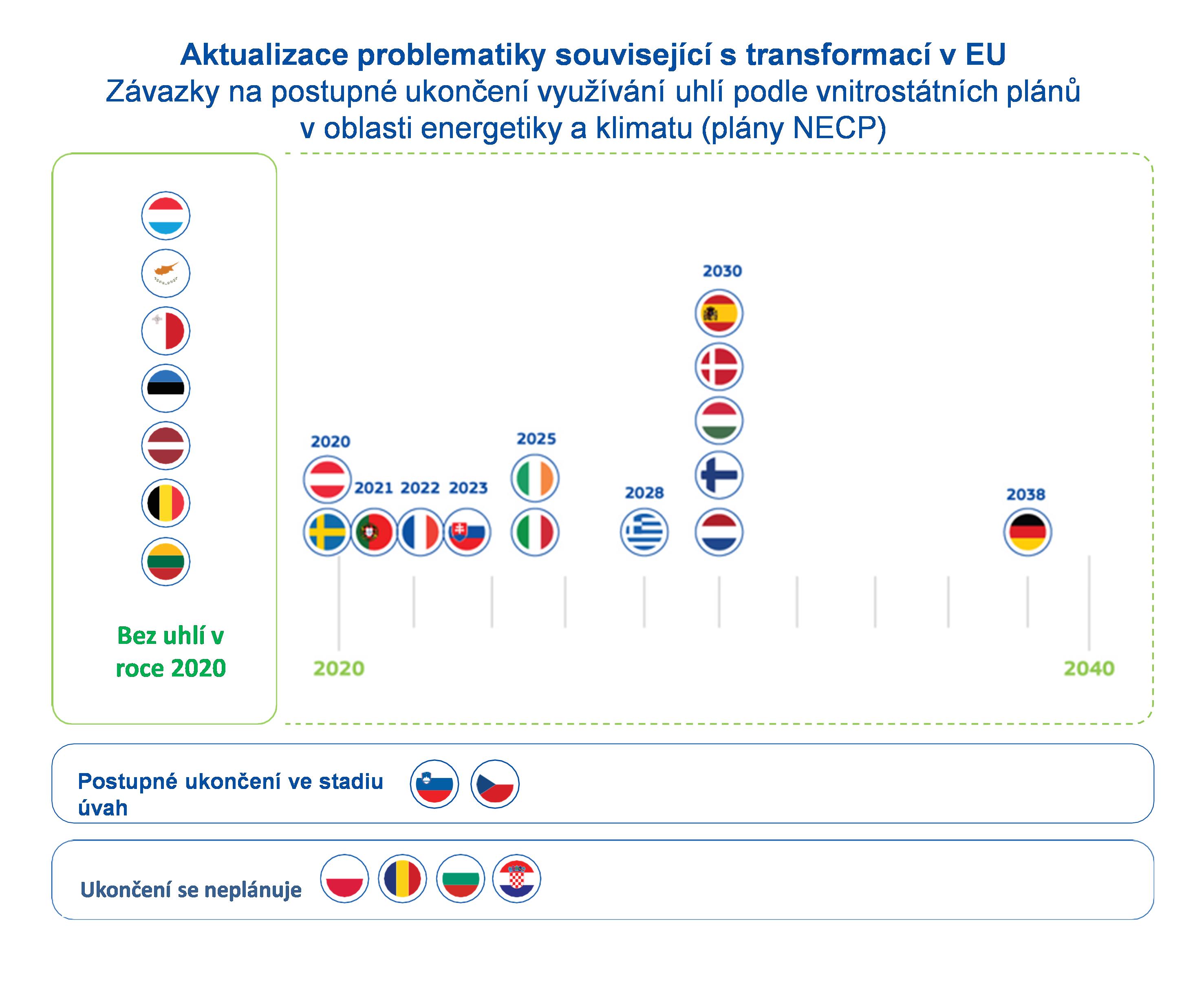 Celkem 21 členských států buď již uhlí nevyužívá (Estonsko, Lotyšsko, Litva, Belgie, Malta, Lucembursko, Kypr), nebo se zavázalo k postupnému ukončení využívání uhlí (včetně lignitu a rašeliny), přičemž ve svých plánech NECP uvádí konkrétní údaje (viz výše uvedený graf). Dva členské státy (Slovinsko, Česko) stále zvažují postupné ukončení využívání uhlí, zatímco čtyři (Polsko, Rumunsko, Bulharsko, Chorvatsko) dosud žádné postupné ukončení neplánovaly. V této souvislosti se předpokládá, že využívání uhlí se do roku 2030 ve srovnání s rokem 2015 sníží o 70 % a elektřina z obnovitelných zdrojů bude představovat 60 % elektřiny vyrobené v EU.