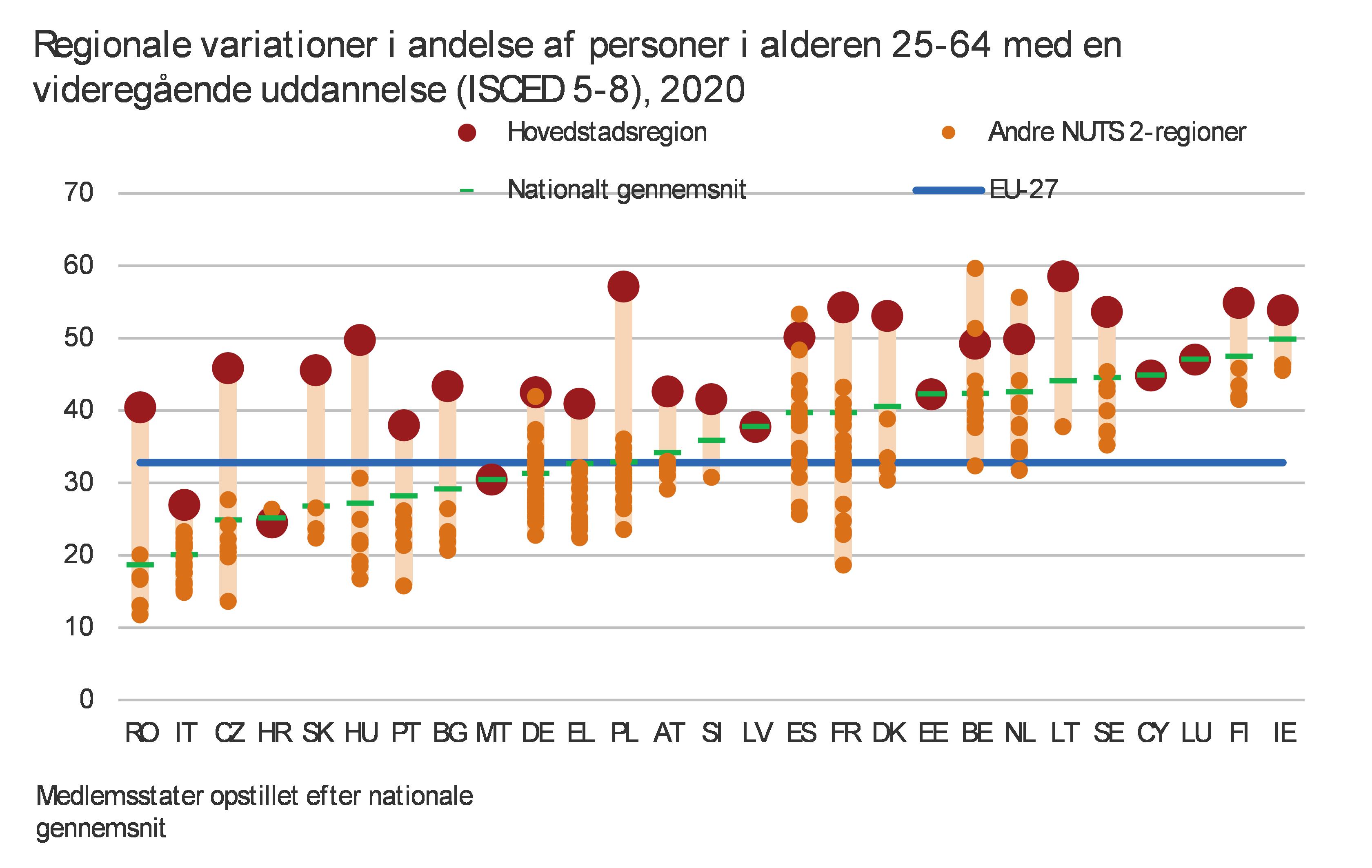 Selv om faldet i befolkningen i den erhvervsaktive alder er udbredt, idet mere end halvdelen af EU's befolkning bor i regioner, hvor den falder, kombineres dette fald i nogle regioner med yderligere strukturelle udfordringer. I forhold til EU-gennemsnittet har nogle regioner en betydeligt lavere andel af personer med en videregående uddannelse, og unge voksne (i alderen 20-24 år) er forholdsvis mindre tilbøjelige til at tage en videregående uddannelse. Selv om andelen af personer med en videregående uddannelse i aldersgruppen 25-64 år på EU-plan er stigende, fordi yngre aldersgrupper er mere uddannede end ældre, steg denne andel desuden langsommere i disse regioner, og denne tendens forventes at fortsætte. Med en faldende eller stagneret andel af højtuddannede arbejdstagere vil disse regioner ikke være i stand til at kompensere for en faldende arbejdsstyrke med højt kvalificerede arbejdstagere. Hvis der ikke gøres noget ved dette, vil det øge talentforskellen og den økonomiske kløft i forhold til mere dynamiske EU-regioner.