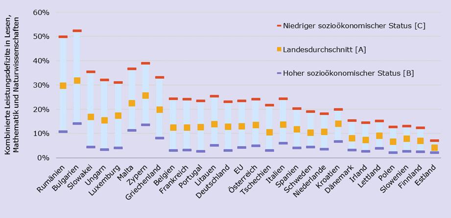 Der neue EU-weite Indikator für Chancengleichheit in der Bildung basiert auf der internationalen Schulleistungsstudie der OECD (PISA). Er zeigt den Anteil von unterdurchschnittlichen Leistungen in den Bereichen Lesen, Mathematik und Naturwissenschaften (kombiniert) bei den 15-Jährigen im untersten Viertel des sozioökonomischen Status [C] an. Die beiden Vergleichswerte sind [A] der durchschnittliche Anteil der unterdurchschnittlichen Leistungen im Land und [B] der Anteil der unterdurchschnittlichen Leistungen im obersten Viertel des Index des wirtschaftlichen, gesellschaftlichen und kulturellen Status (ESCS).