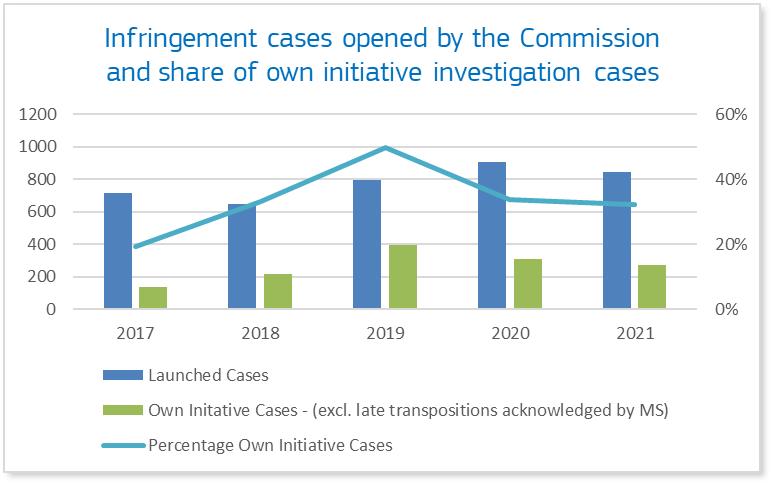 In recent years, a larger proportion of cases are opened following the Commission’s own investigations. These own-initiative infringement cases have made it possible for the Commission to further its strategic approach to enforcement, pursuing priority cases as set out in the 2016 Communication, including the incorrect transposition of directives and acting swiftly and firmly on infringements which obstruct fundamental freedoms and values of the EU.