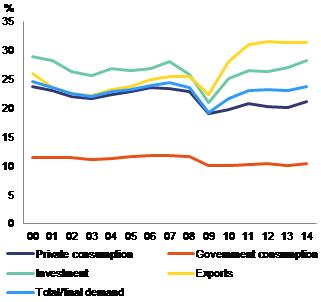 ()The specification of imports equation is given by To take into account the different import content of domestic demand (DD) and exports (X), both variables are included separately in the equation, as well as a competitiveness indicator.