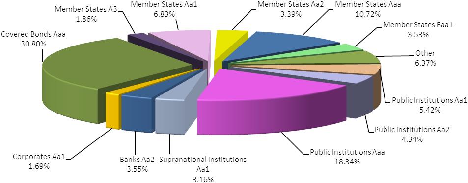 As at 31 December 2014, the nominal value of the investment portfolio was EUR 1 772.5 million (2013: EUR 1 739.8 million), against a market value of EUR 1 830.8 million (2013: EUR 1 776.9 million), excluding accrued interest.