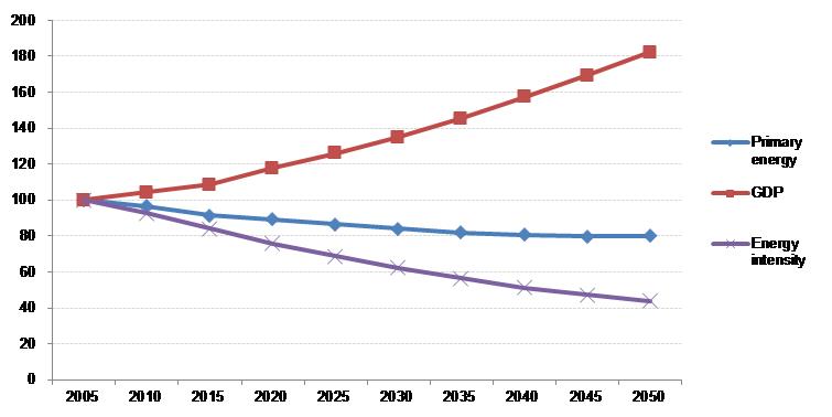 Figure 38: Decoupling of EU energy use and intensity from GDP (2005=100)
