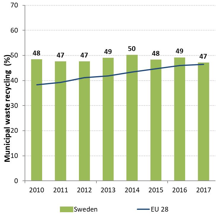 The circular (secondary) use of material in Sweden was 7.1 % in 2016 (below the EU-28 average of 11.7 %. Sweden ranks below the EU-28 average in terms of the number of people employed in the circular economy (1.56 % of total employment in 2016, whereas the EU-28 average is 1.73 %).