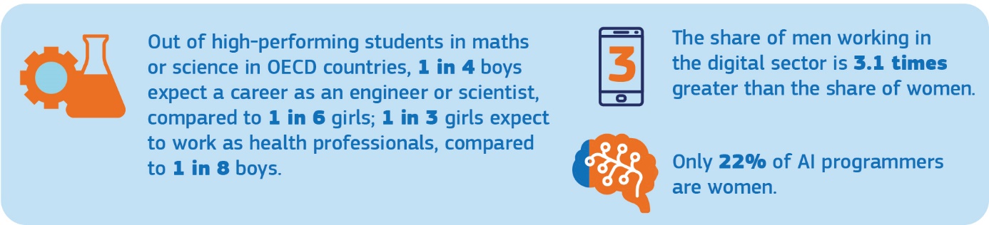 . Women only represent 17% of people in ICT studies and careers in the EU and only 36% of STEM graduates, despite the fact that girls outperform boys in digital literacy