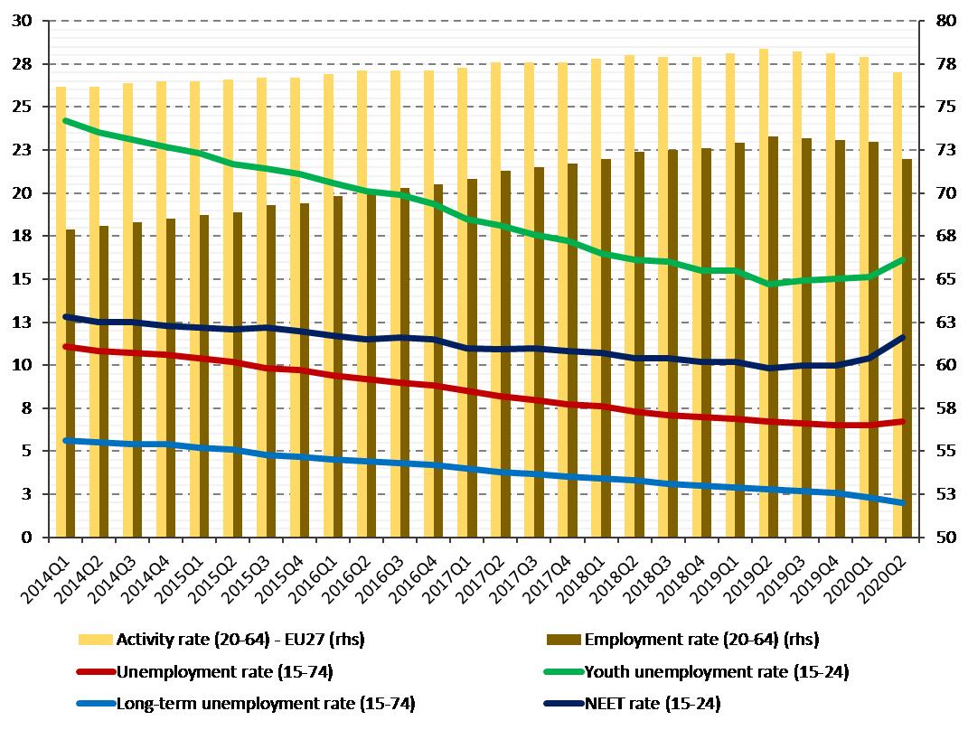 The COVID-19 crisis has strongly affected labour market outcomes in the EU. Though signs of slowdown in employment figures were already evident in the second half of 2019, most labour market indicators have interrupted their positive trend at the outbreak of the pandemic. Total employment (that had increased by 15 million since mid-2013) went down by 6.1 million persons between the fourth quarter of 2019 and the second quarter of 2020, the sharpest decline observed over two successive quarters. After six years of positive developments towards the Europe 2020 employment target, the employment rate got farther from it in 2020. The swift adoption of short-time work schemes and other labour market retention measures, together with a decline in activity rates, led so far to an only moderate increase in the unemployment rate, of 1 percentage point (pp) by September 2020. Youth unemployment (15-24) nevertheless increased more markedly than unemployment for other age cohorts, and the share of young people not in employment nor in education or training (NEET) soared. Non-EU born workers have also been severely affected. These outcomes vary significantly across countries, regions and sectors and require close monitoring and policy efforts to avoid a more negative impact in the short run.