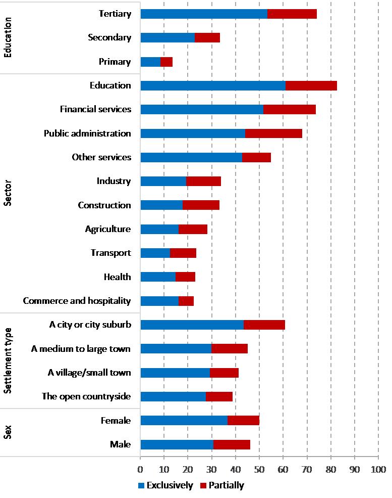 60 pps gap in access to teleworking between high-skilled and low-skilled workers 61% of those living in cities had access to telework, compared to 41% of those living in small towns Workers in education and administrative services used teleworking to a larger extent |