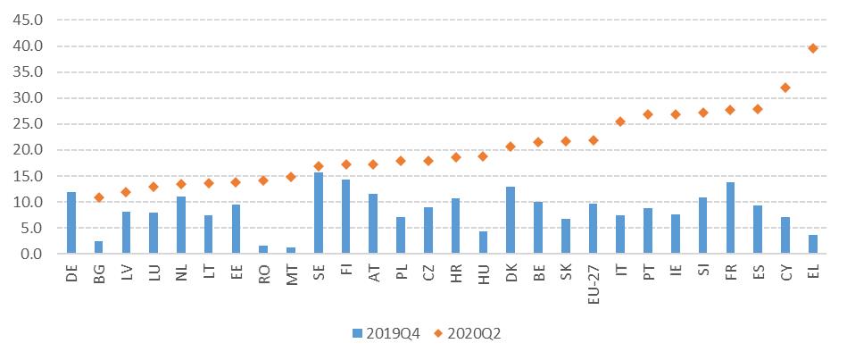 Massive use of short-time work schemes helped mitigate the consequences of the shock on the labour market. The hours worked per worker fell abruptly, by 11.3% in Q2-2020 compared to the last quarter of 2019; at the same time, absences from work buoyed, from 9.7% in Q4-2019 to 21.8% in Q2-2020 (around half of this increase being due to temporary lay-offs). Since the onset of the crisis, Member States have extended (or introduced when not previously available) short-time work schemes and/or other job preservation schemes, with the aim to limit job losses, avoid the dispersion of human capital and sustain aggregate demand. The European Union is supporting this effort with the temporary instrument Support to mitigate Unemployment Risks in an Emergency (SURE). The extraordinary and synchronised use of short-time work schemes helped addressing the immediate consequences of the crisis and prevented a surge in unemployment. However, the longer the crisis lasts, the higher the risk of subsidising jobs in firms that are no longer viable. Therefore, when considering the phasing out of short-time work schemes, it is important to carefully weigh, on the one hand, the need to protect firms and employees as long as the economic conditions require and, on the other hand, the introduction of policies to promote structural change and the reallocation of workers (e.g. via well-designed hiring incentives and reskilling measures).