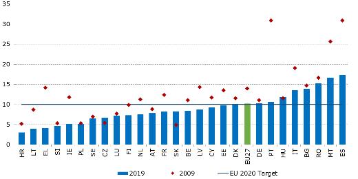 Due to COVID-19, Member States risk facing a sharp increase in youth unemployment, which calls for reforms and reinforced support. After a continued decline in 2019, EU-wide youth unemployment jumped from a low of 14.9% in March 2020 to 17.1% in September, increasing at a faster rate than overall unemployment. The crisis also led to the largest increase between two consecutive quarters in the rates of 15 to 24 year-olds not in employment, education or training since the start of Eurostat series in 2006 (from 10.4% to 11.6% between Q1-2020 and Q2-2020). In 2019, one in ten young people aged 18-24 left education or training with a qualification below upper secondary education, and more than a quarter of people aged 30 to 34 did not have a qualification with direct labour market access (secondary vocational education and training or tertiary education qualification). The Commission proposals for the VET Recommendation and the European Education Area put forward targets to improve attainment in both VET and tertiary education. Since the increases in the NEET rates largely stem from the drop in labour demand, reforms to support job creation, education and skills will be essential. A successful implementation of the reinforced Youth Guarantee, relying on well-functioning Public Employment Services and education and training systems, will be crucial. For young NEET women, among whom inactivity plays a stronger role than for men, reforms should also include measures to remove fiscal disincentives to work and help reconcile work and care responsibilities (see also further below).