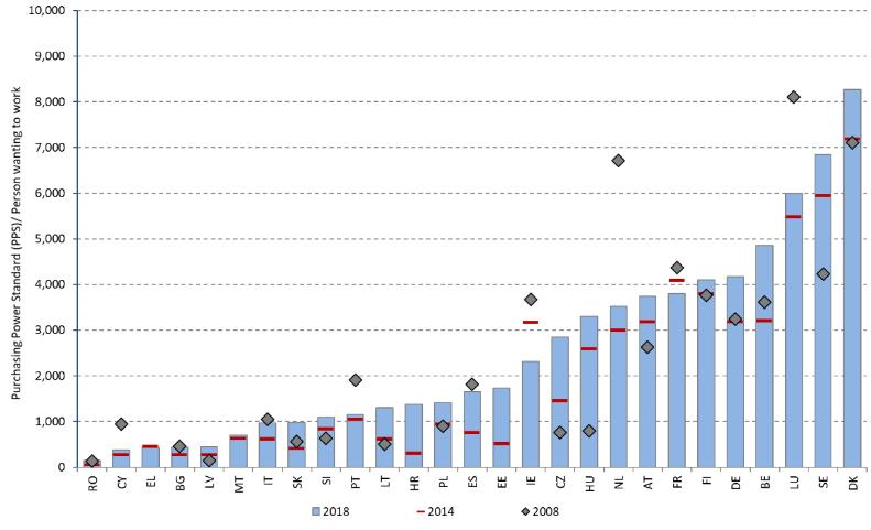 Note: 2018-2019 changes, except 2017-2018 for at-risk-of poverty rate of unemployed, unemployment trap and gender pay gap.