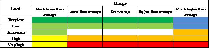 The latter condition prevents a Member State presenting "high" or "very high" level to be flagged as "deteriorating" when showing a change "much lower than average", but still improving.