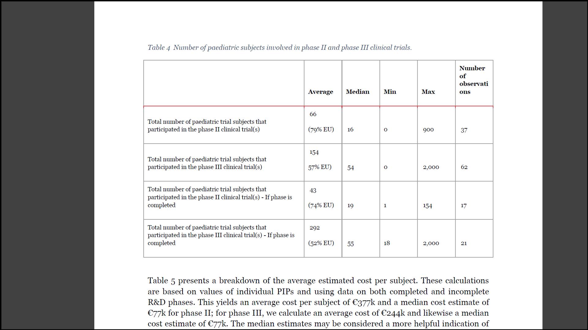 This suggests that cost per trial subject is likely to be higher for paediatric studies. In this section we compare the average cost estimates presented in this study with that available in the literature looking at the cost involved in adult/mixed trials.