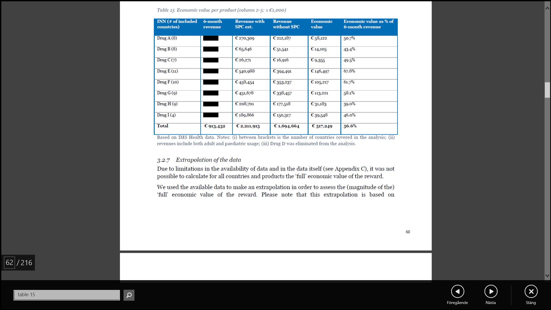 ·The second step in the extrapolation is to include the (four) products for which the period of exclusive rights, including the SPC-extension period, ended within the research period taken into account (December 2015), which is after the date of the dataset available for the study (third quarter 2014). Drug D, for which the data did not allow to make a distinction between protected and non-protected products with an SPC extension, was also included. Based on the total population in the specific countries associated with the specific year in which the patent expires and ‘revenue and economic value per capita’ of the eight products in our dataset, we made an estimation of the 6-month revenue and the economic value of the SPC reward for the products. Based on this second step in the extrapolation, the adjusted economic value, €926m, increased with 79% in comparison to the original estimated economic value of €517m. Please note that the therapeutic areas of autoimmune diseases, diabetes mellitus and antipsychotics are not covered in the original set of eight products, which increases the uncertainty of the extrapolation.