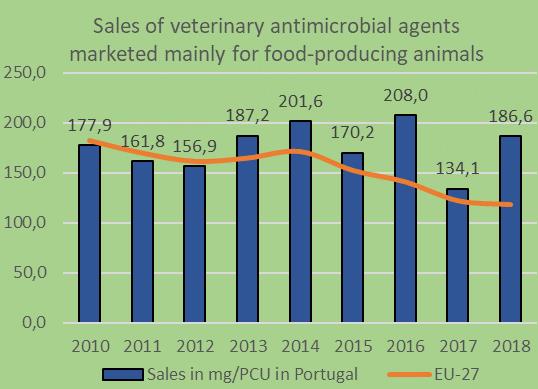 ·Contribute to the EU Green Deal target on antimicrobials by putting in place sizeable efforts to significantly reduce the use of antimicrobials in farming, considering that the figures indicate sales of antimicrobials above the EU average. Portugal is encouraged to use all available tools, including instruments under the CAP, to support the farmers e.g. by promoting best practices on reduced and prudent use of antimicrobials, together with improved livestock management, biosecurity, infection prevention and control.