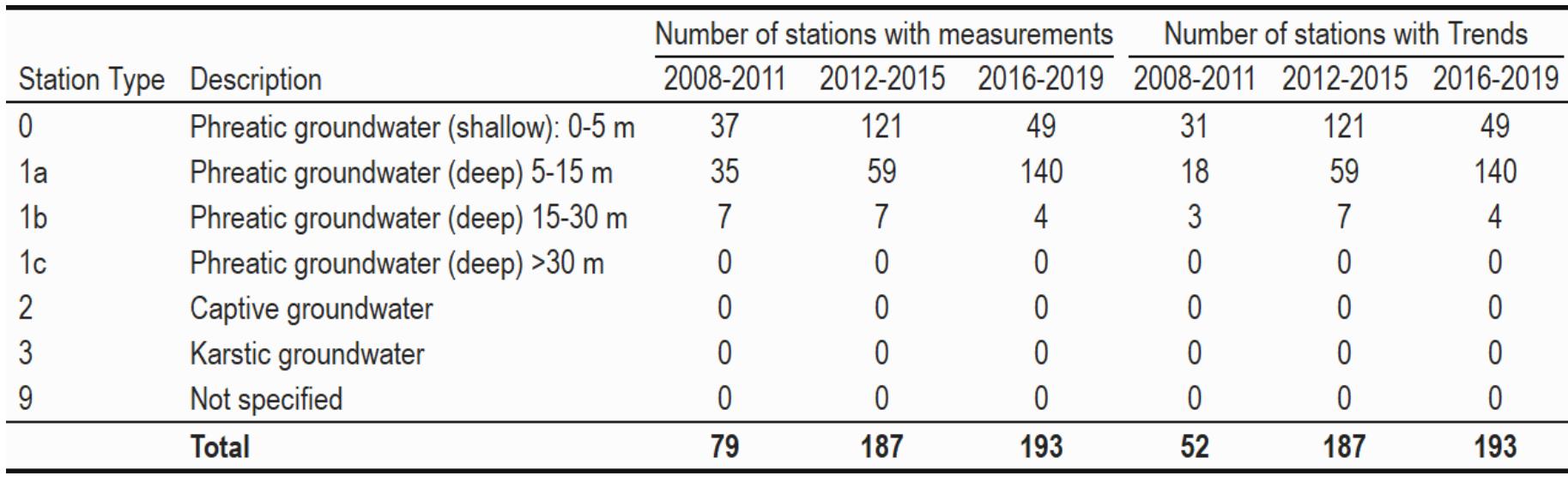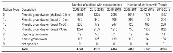 Table 22: Number of stations with trends for groundwater monitoring points in the periods 2008-2011, 2012-2015 and 2016-2019.38