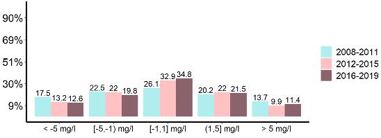 Figure 40. Comparison of percentage of monitoring points in the three reporting periods by classes of average NO3 annual trends (x axis).