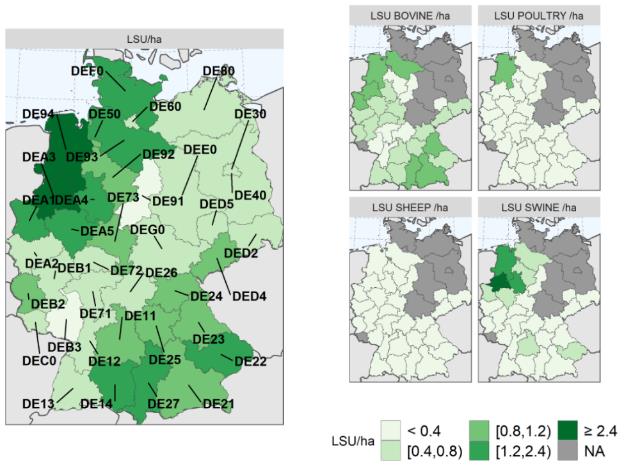 Map 1: Livestock density by NUTS2 expressed as livestock units per hectare of UAA, year 2016 (Source: Eurostat, February 2021)18