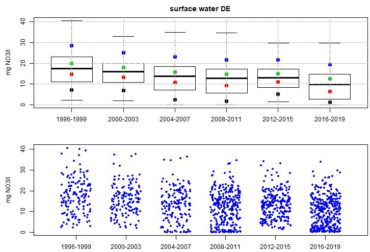 Figure 20. Time series of box whisker plots along with the distribution of the values average NO3 annual concentrations for each reporting period for surface water stations. RPs represent the reporting periods, RP7 being the last period (2016-2019). The blue, red, green and black dots represent the mean of the fourth third, second and first quartiles, respectively.