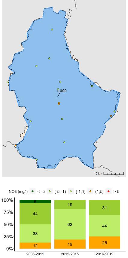 Figure 23. Spatial distribution of average NO3 annual trends (map) and corresponding percentage of monitoring points per classes of trends by reporting period (x axis). The percentages below 5% are not labelled, see the next plot for more information.