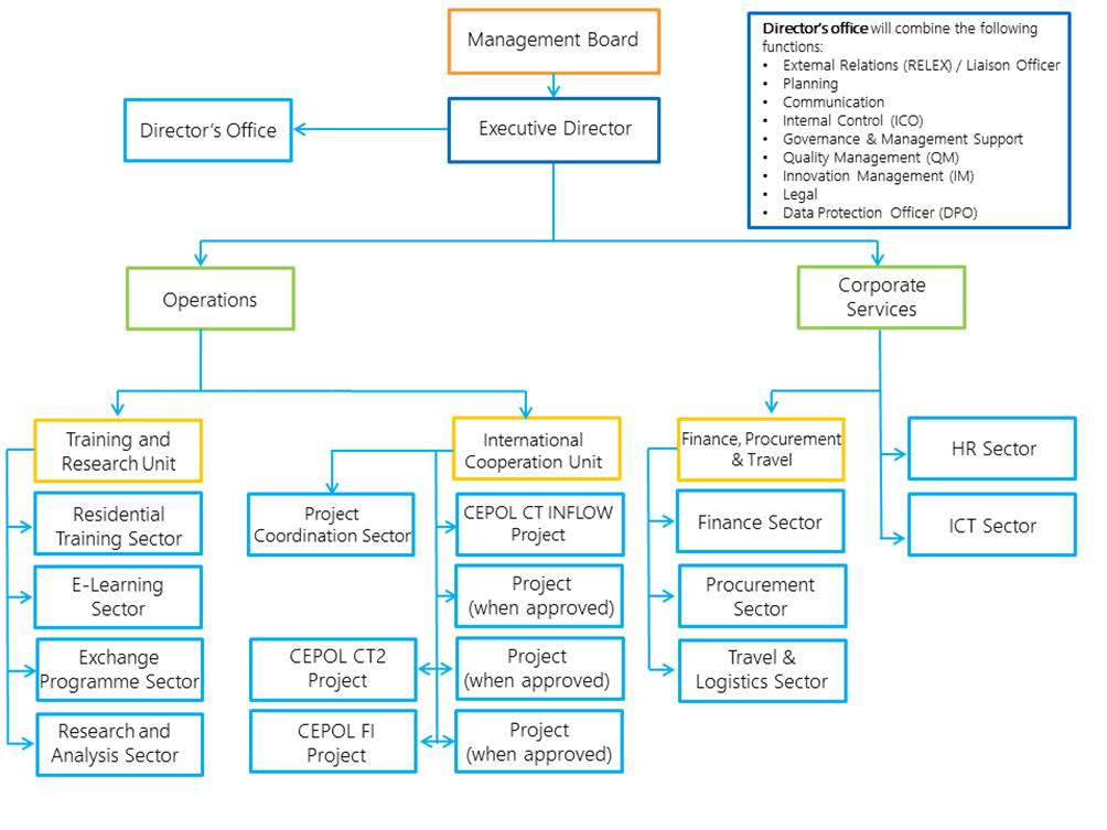 The present mandate brought about new coordination and analytical tasks for CEPOL, together with implementing capacity-building projects in third countries by managing dedicated Union External Assistance funds, however this was not accompanied with any additional training agents post.