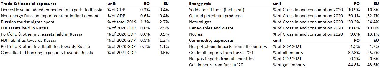 This box summarizes risks and exposures regarding the commodity price surge, and the importance of direct links with the Russian economy. The surge of commodity prices since 2021 had been aggravated by the Russian military aggression against Ukraine. This box reviews the risks for the macroeconomic vulnerabilities of Romania. Romania shares an important border with Ukraine and is subject to some direct repercussions from the war, most notably refugee inflows, although the majority leave to other countries. In contrast, most Romanian trade and financial links with both Ukraine and Russia are fairly small. Gas and oil imports from Russia are the only notable exceptions, with some implications for the domestic economy.