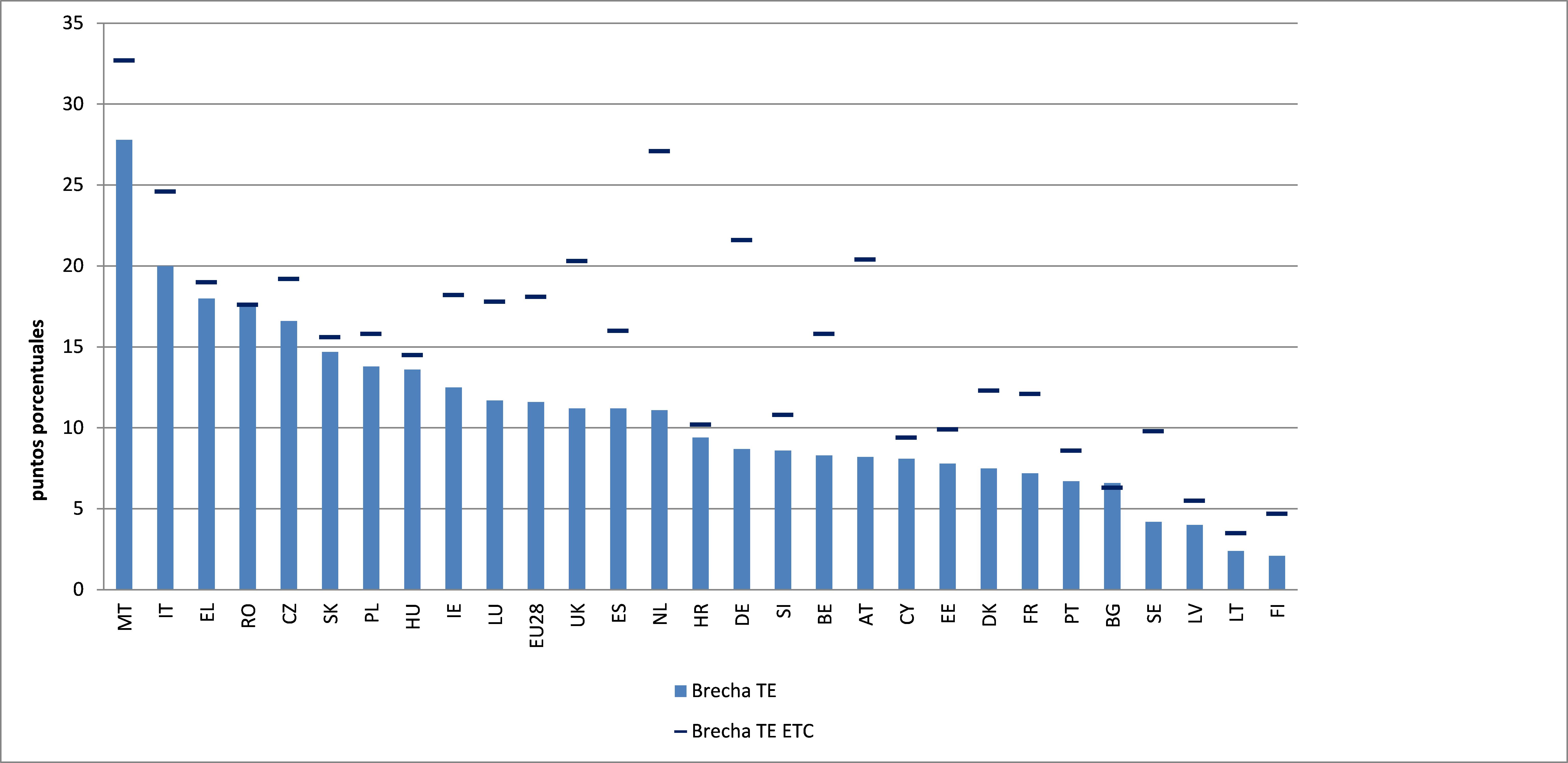 Figura 1: Diferencias de la tasa de empleo (20-64) y la tasa de empleo equivalente a tiempo completo entre hombres y mujeres en 2015