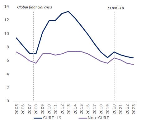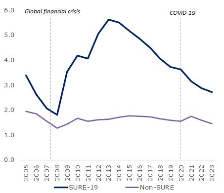 En 2021, sobre todo en la primera mitad del año, cuando la pandemia seguía causando estragos, el SURE siguió apoyando a unos 9 millones de personas y a más de 800 000 empresas. Las medidas de apoyo económico siguieron siendo necesarias en el primer semestre de 2021, pero se fueron eliminando posteriormente a medida que las repercusiones económicas y sanitarias de la pandemia disminuían a finales del mismo año, debido a las vacunas y a la adaptación de las economías a los cambios inducidos por la pandemia de COVID-19.