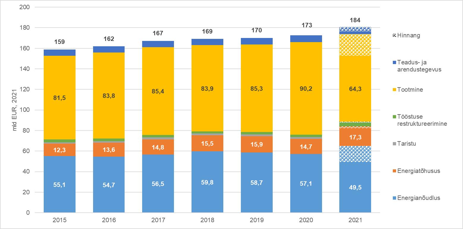 Pärast ajutist langust 2020. aastal suurenesid energiatõhususe meetmete toetused 2021. aastal taas, jõudes 19 miljardi euroni. See tähendab, et 2015. aastaga võrreldes on need toetused kasvanud 54 % võrra (+6,5 miljardit eurot). Lisaks suurenes tööstuse restruktureerimise toetuste hinnanguline summa 2021. aastal 4,6 miljardi euroni (võrreldes 2,3–2,4 miljardi euroga kahel eelneval aastal). Kasv oli peamiselt tingitud suuremast rahalisest toetusest kivi- ja pruunsöekaevanduste sulgemiseks ning sellega seotud majandusliku ülemineku meetmete rakendamiseks. Energiatootmise toetused aga vähenesid 5 % (–5 miljardit eurot), kuna taastuvenergia (peamiselt päikeseenergia) tootmiseks antud toetused kahanesid oluliselt kõrgemate elektri hulgimüügihindade tõttu, mis mõjutasid lisatasu ja hinnavahelepingu tüüpi toetuskavasid.