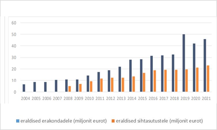 Euroopa tasandi erakondadele ja poliitilistele sihtasutustele eraldatud ELi rahaliste vahendite kogusumma on aja jooksul märkimisväärselt suurenenud: 2021. aastal eraldati Euroopa tasandi erakondadele 46 miljonit eurot ja Euroopa tasandi poliitilistele sihtasutustele 23 miljonit eurot.