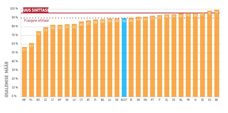 Joonis 2. Üle 3-aastaste laste alushariduses ja lapsehoius osalemise määr (praegune eesmärk 90 %, sissetulekuid ja elamistingimusi käsitleva ELi statistika 2019. aasta andmed)