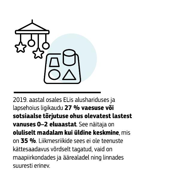 Euroopa sotsiaalõiguste samba 11. põhimõtte kohaselt on lastel õigus kvaliteetsele ja taskukohasele alusharidusele ja lapsehoiule. Nõukogu soovituses kvaliteetsete alusharidus- ja lapsehoiusüsteemide kohta 6 toetatakse liikmesriike nende jõupingutustes parandada alushariduse ja lapsehoiu kättesaadavust ja kvaliteeti ning julgustatakse neid võtma vastu kvaliteediraamistikku. ELi lapse õiguste strateegia 7 ja Euroopa lastegarantii 8 moodustavad uue tervikliku ELi poliitikaraamistiku, mille eesmärk on kaitsta kõikide laste õigusi ja tagada haavatavas olukorras või ebasoodsatest oludest pärit lastele juurdepääs põhiteenustele. Just Euroopa lastegarantii on loodud selleks, et tagada kõigile vaesuse või sotsiaalse tõrjutuse ohus olevatele lastele Euroopas tasuta ja tõhus juurdepääs kvaliteetsele alusharidusele ja lapsehoiule. Liikmesriikidelt nõutakse nende eesmärkide elluviimiseks riikliku tegevuskava koostamist.