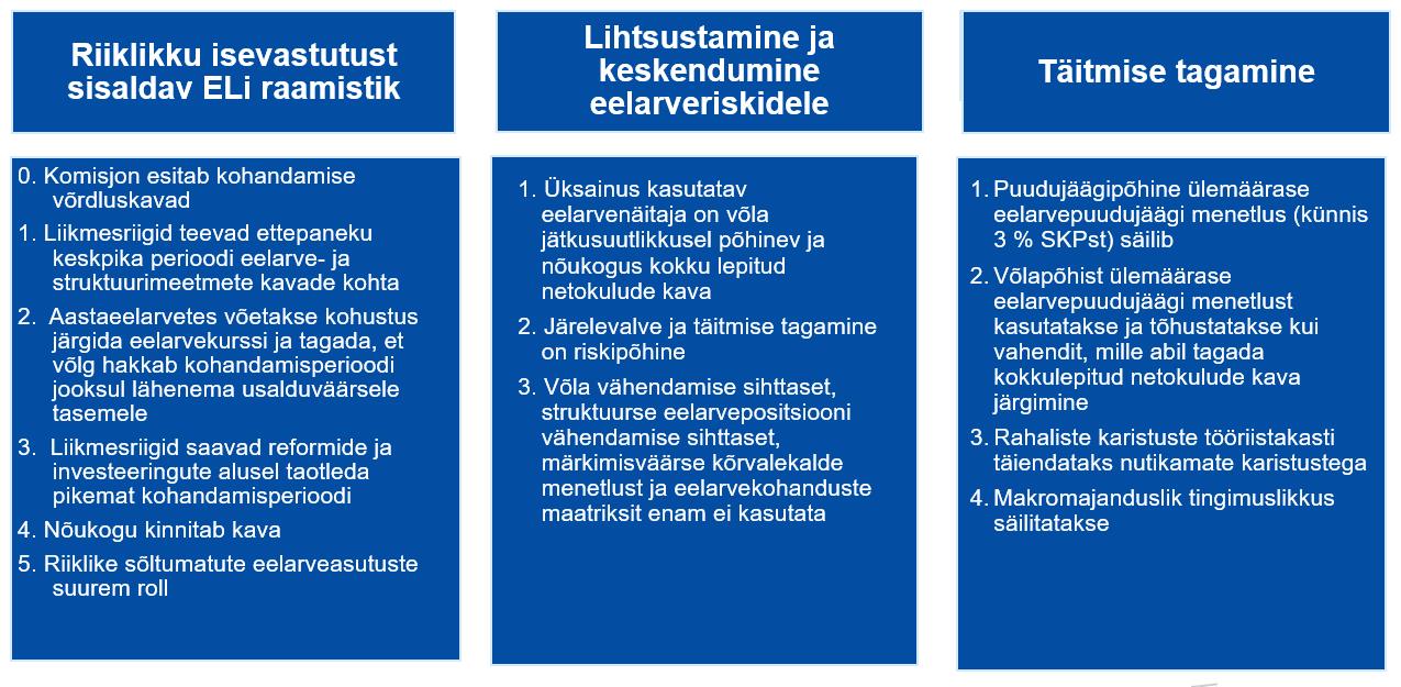 Käesolevas osas esitatakse majanduse juhtimise raamistiku reformimist puudutavate komisjoni suuniste põhijooned (vt joonis 2). Kavandatava reformitud raamistiku loomise ja rakendamisega seotud konkreetseid küsimusi käsitletakse üksikasjalikumalt neljandas osas, kus võetakse vaatluse alla ka raamistik, mida kohaldada euroala liikmesriikide suhtes, kellel on või võivad tekkida raskused finantsstabiilsuse tagamisel.