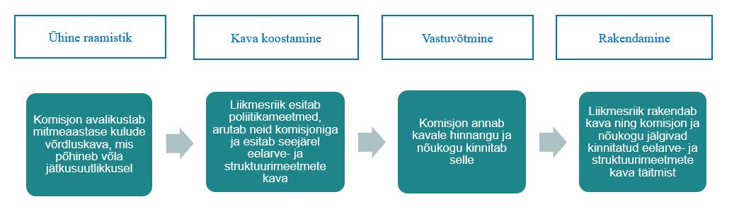 Järgmise etapina esitaks iga liikmesriik oma keskpika perioodi eelarve- ja struktuurimeetmete kava komisjonile hindamiseks ja nõukogule kinnitamiseks. Neis kavades kirjeldataks keskpika perioodi eelarvepoliitika meetmeid ning reformi- ja investeerimiskohustusi. Eelarve kohandamise kava koostamisel lähtutaks esmastest netokuludest, st kuludest, millest on maha arvatud kaalutlusõiguse alusel võetud tulumeetmed ning mille puhul jäetakse välja intressikulud ja tsüklilise töötuse kulud. Keskpika perioodi eelarvekava kajastataks vastavates aastakulutuste ülemmäärades. Nende liikmesriikide kavad, kelle puhul on makromajandusliku tasakaalustamatuse menetluse raames tuvastatud tasakaalustamatus, sisaldaksid ka selle tasakaalustamatuse korrigeerimiseks mõeldud reforme ja investeeringuid. Kava esitamisele eelneks põhjalik tehniline dialoog komisjoniga. Komisjon hindaks keskpika perioodi kava integreeritud viisil, võttes arvesse eelarvesuundumuse ning reformide ja investeeringute vastastikust toimet. Hindamine toimuks ELi ühise hindamisraamistiku ja läbipaistva metoodika alusel ning alles on võimalus küsida lisateavet või taotleda läbivaadatud kava esitamist.