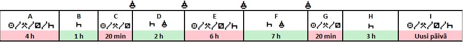 Kuva 8. Esimerkki jaetusta vuorokautisesta lepoajasta, joka on keskeytynyt kerran ensimmäisen lepoajan aikana ja kerran toisen lepoajan aikana