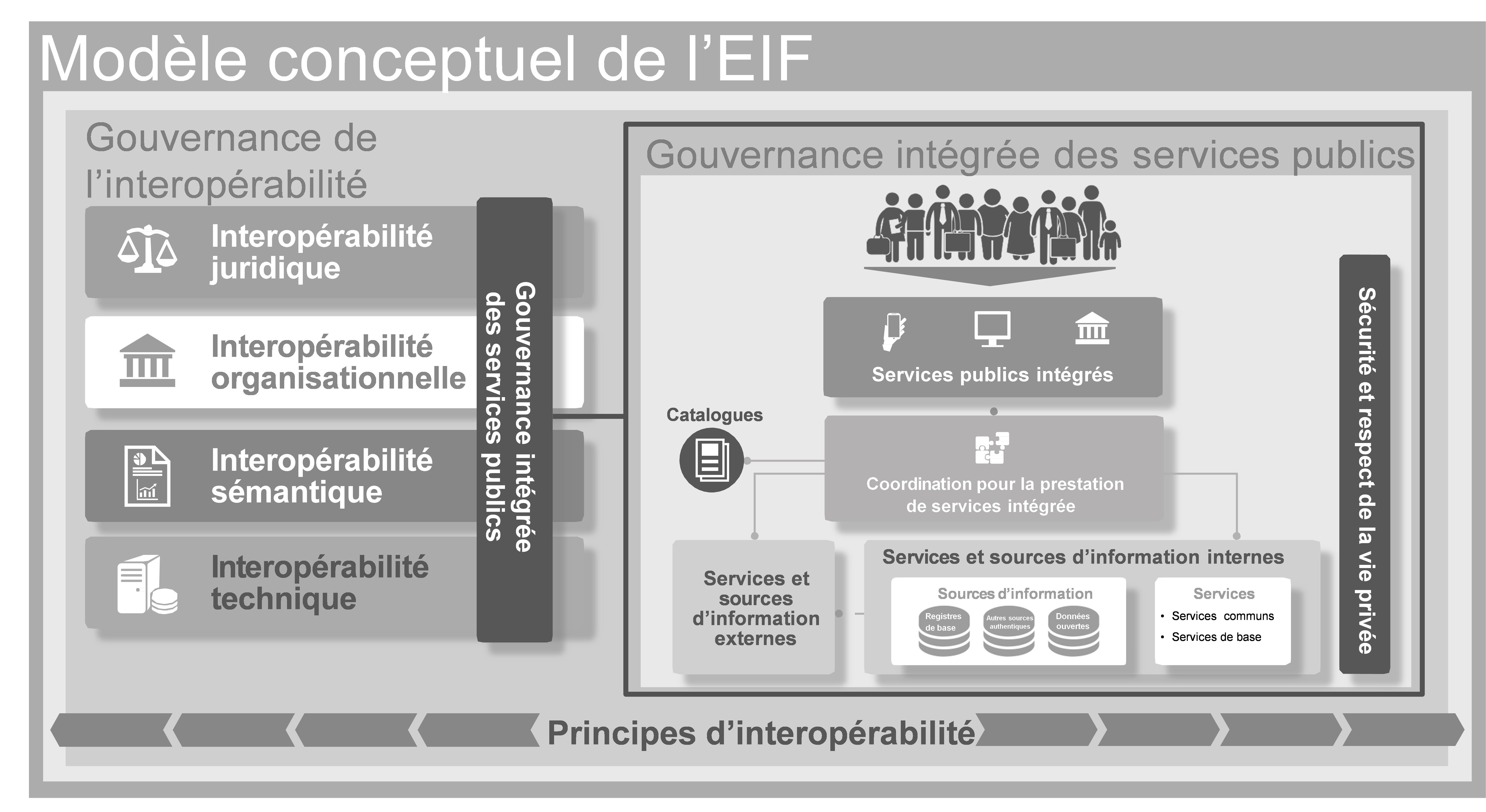 Le modèle conceptuel de l’EIF pour les services publics couvre la conception, la planification, le développement, l’exploitation et la maintenance de services publics intégrés à tous les niveaux de l’administration publique, du niveau local au niveau de l’Union européenne. Les principes énoncés ici visent à orienter la prise de décision concernant l’établissement de services publics européens interopérables. De plus, l’EIF offre des outils pratiques sous la forme d’un ensemble de recommandations concrètes.