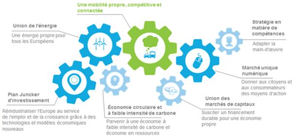 L’importance de la mobilité en général et du transport routier en particulier se traduit par le large éventail des autres cadres d’action de l’UE, qui ont une influence déterminante sur ces deux thématiques. Par leur succès, les priorités arrêtées par la Commission Juncker, que sont l’union de l’énergie, le marché unique numérique et le programme en faveur de l’emploi, de la croissance et de l’investissement, contribuent toutes aux transports et à la mobilité. Dans la stratégie pour une union de l’énergie de février 2015, a été définie comme l’un de ses grands domaines d’action la transition vers un secteur des transports économe en énergie et décarbonisé tandis que, dans le train de mesures «Une énergie propre pour tous les Européens» de novembre 2016, figurait une mesure visant à accélérer le déploiement des carburants à faible intensité de carbone pour les transports et à soutenir l’électromobilité. Les mesures déjà présentées dans la stratégie pour une mobilité à faible taux d’émissions, adoptée en juillet 2016, sont à présent mises en œuvre. Les investissements dans les infrastructures réalisés au titre du plan d’investissement pour l’Europe constituent une forte incitation à la mobilité européenne propre, compétitive et connectée du futur. Comme l’énonce le socle européen des droits sociaux, la construction d’une Europe plus juste et le renforcement de sa dimension sociale constituent une priorité majeure pour l’actuelle Commission. Ces objectifs doivent également valoir dans le secteur de la mobilité et concourir à un marché du travail équitable et qui fonctionne bien.