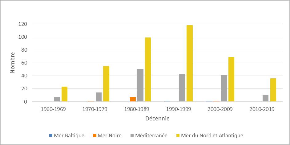 La plupart des installations en mer présentes dans les eaux de l’Union ont été construites entre 1980 et 2000. Depuis 2010, la construction de nouvelles installations de production a largement chuté dans la mer du Nord, l’Atlantique et la mer Méditerranée (tableau 2 et graphique 1). Le présent rapport fournit, à l’annexe I, un aperçu détaillé indiquant l’année de construction des installations de chaque État membre.