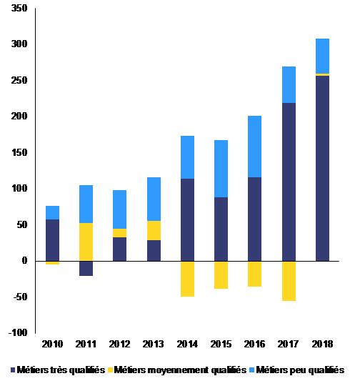 Croissance de l’emploi par profession, cumulée, milliers d’unités