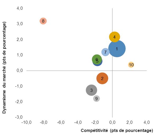 Dynamisme du marché et compétitivité des exportations de biens pour les dix principaux secteurs (2000-2018)