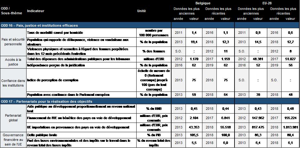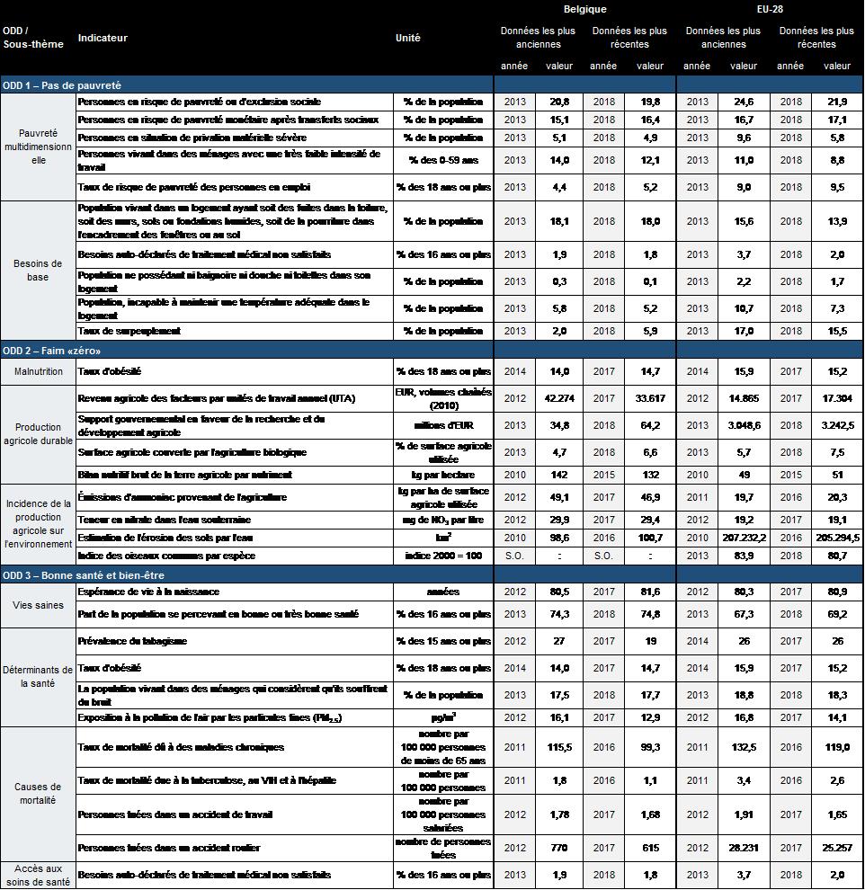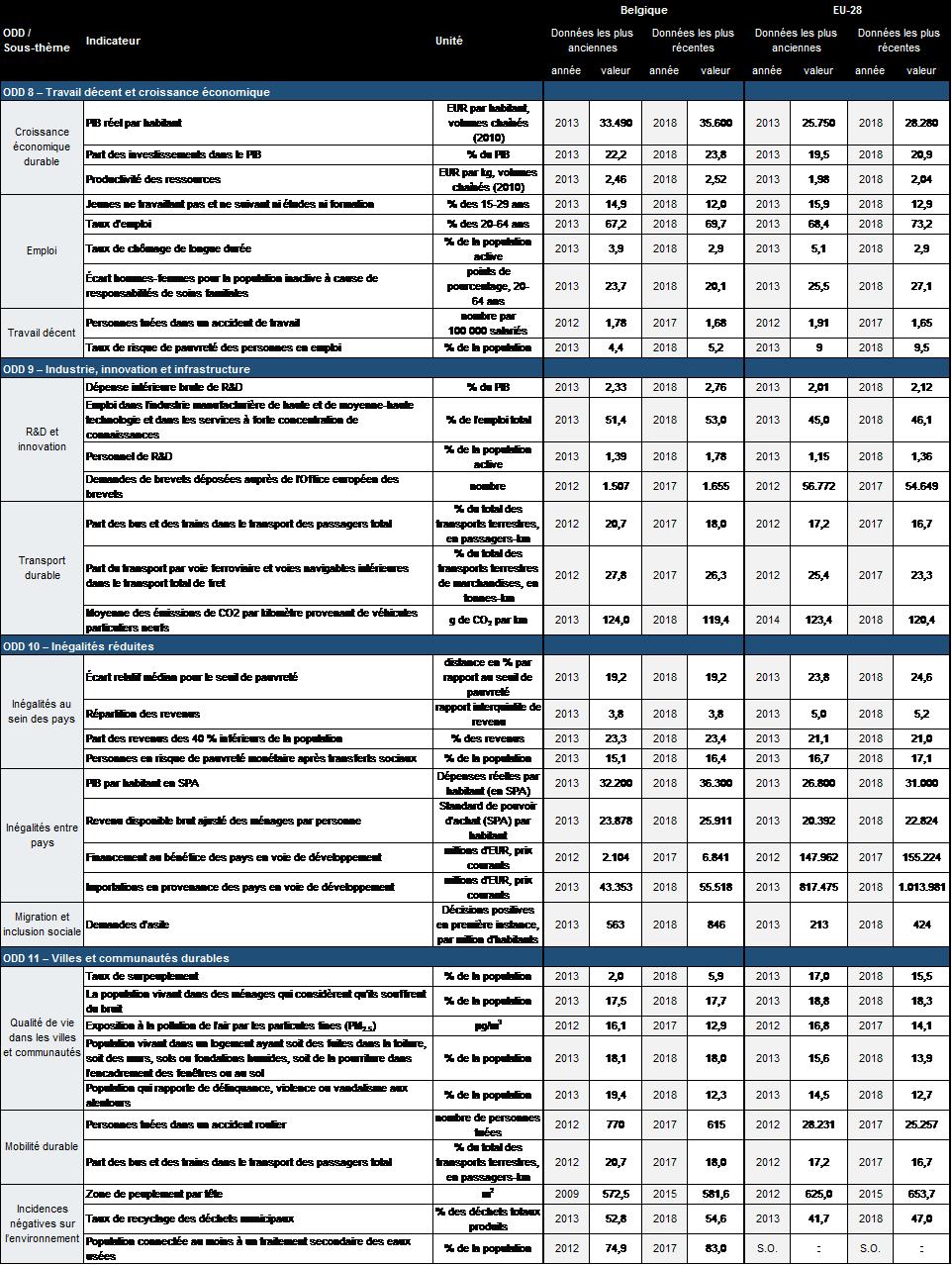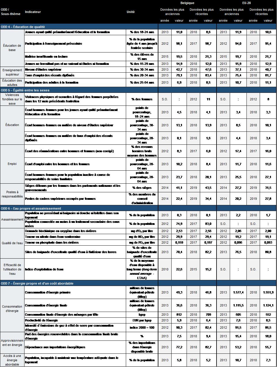 Tableau E.1:Indicateurs de mesure des progrès accomplis par la Belgique en vue de la réalisation des ODD