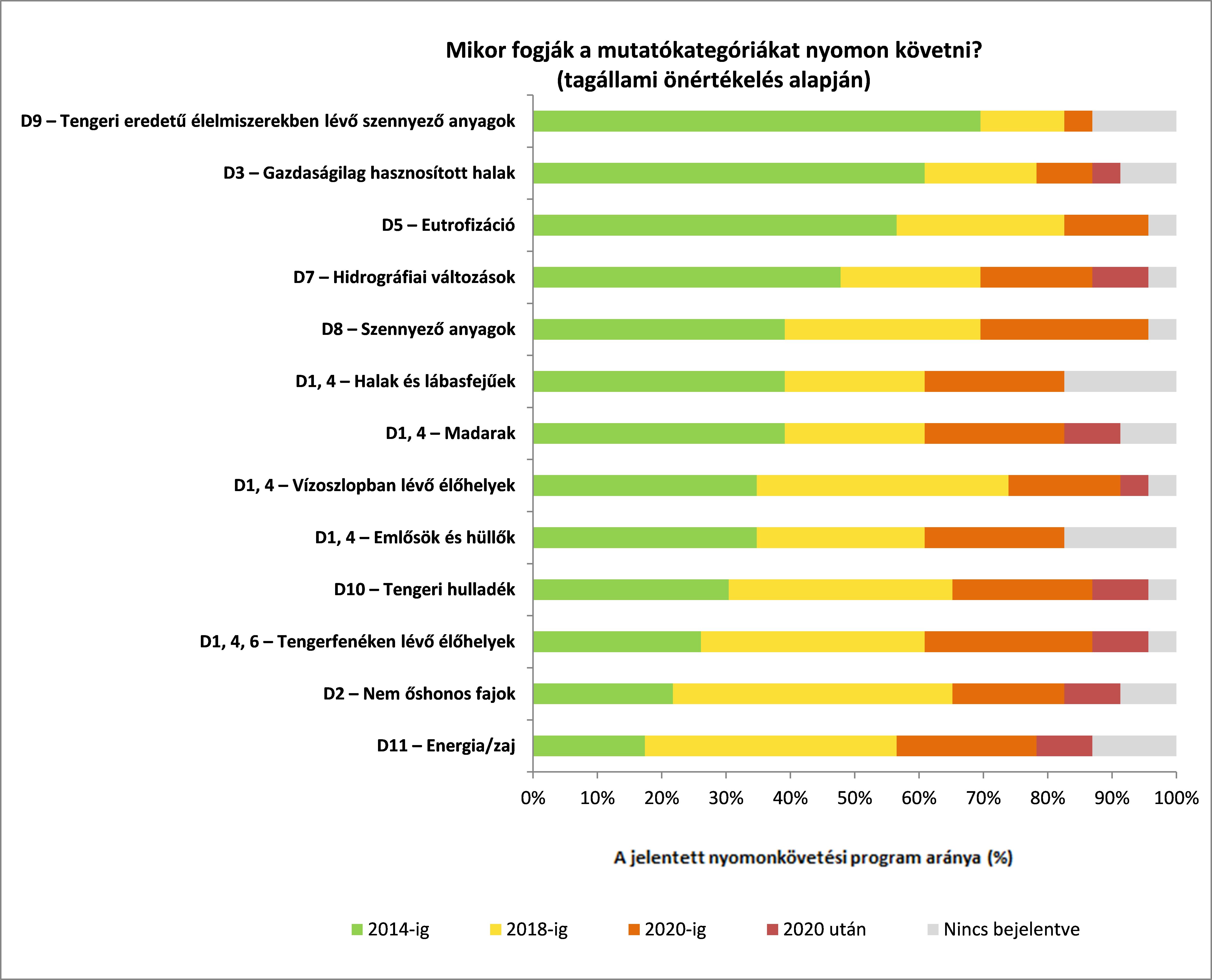 A tagállamoknak 2014. július 15-ig kellett kidolgozniuk és végrehajtaniuk nyomonkövetési programjaikat. A 3. ábra mutatókategóriákra lebontva szemlélteti, hogy a nyomonkövetési programok várhatóan milyen arányban lépnek életbe 2014-ig, 2018-ig, 2020-ig és 2020 után. 2014-ben a tagállamok által legnagyobb arányban nyomon követett mutató a tengeri eredetű élelmiszerekben lévő szennyező anyagok (9. mutató), a gazdaságilag hasznosított hal (3. mutató) és az eutrofizáció (5. mutató) volt. A tagállamok önértékelése alapján 2020-ig életbe fog lépni az eutrofizációra (5. mutató), az emlős-, hüllő-, hal- és lábasfejűfajokra (1. és 4. mutató), valamint a szennyező anyagokra (8. mutató) vonatkozó mutató. Ugyanez várható a gazdaságilag hasznosított hal (3. mutató), a hidrográfiai változások (7. mutató), a tengeri hulladék (10. mutató) és a tengerfenék és a vízoszlop élőhelyei (1., 4. és 6. mutató) esetében alkalmazott nyomonkövetési programok mintegy 90 %-ánál is.