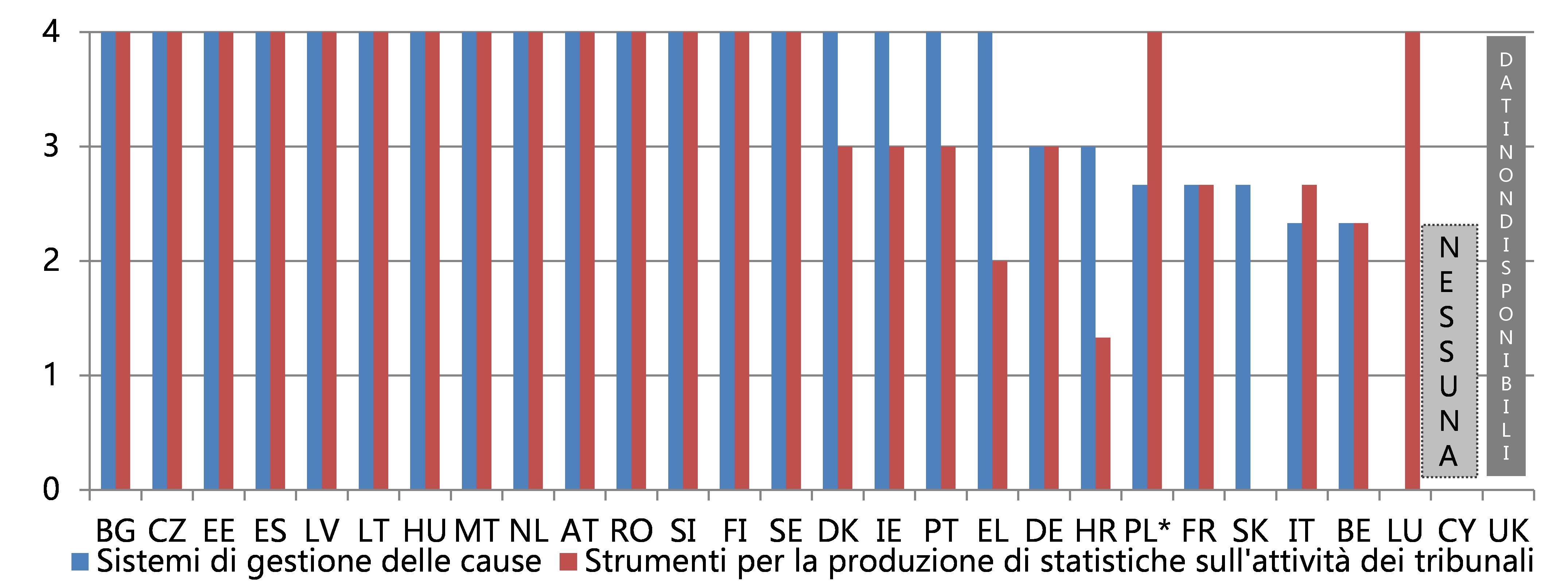 * Agli Stati membri sono stati assegnati punti a seconda del metodo usato per fornire ciascuna tipologia di informazioni. 1,5 punti per la notificazione automatica via mail o SMS, 1 punto per l’accesso online per l’intera durata della causa, 0,5 punti ciascuno per informazioni su richiesta delle parti, discrezionalità del tribunale o qualunque altro metodo usato.