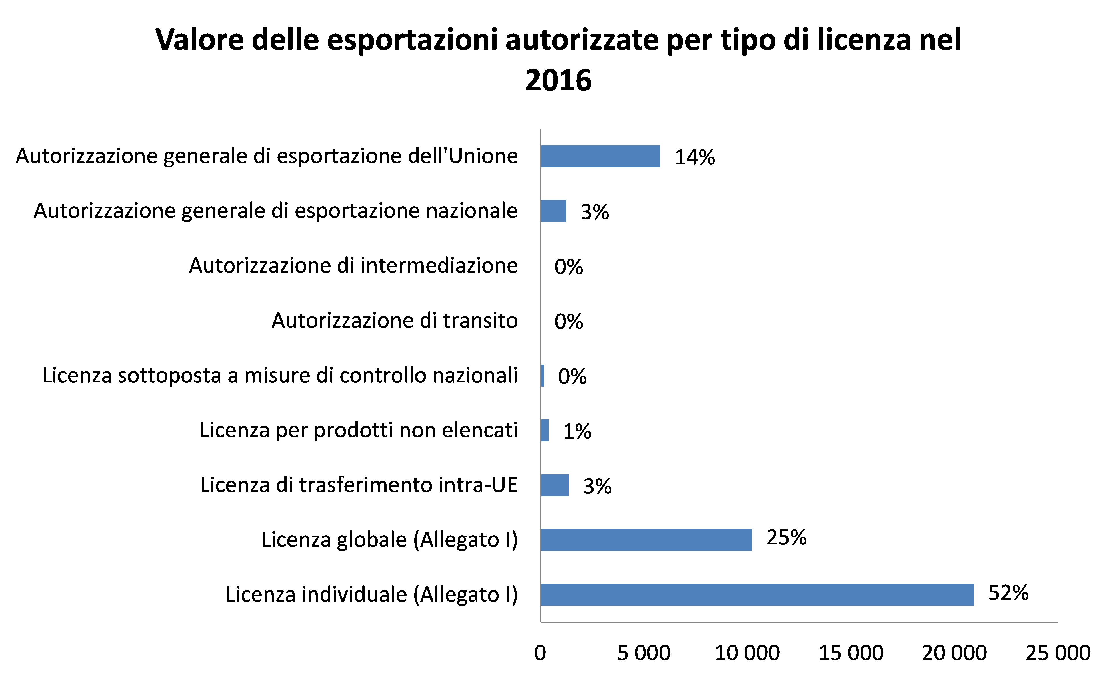 delle domande ha raggiunto i 45,7 miliardi di EUR e quindi le esportazioni di prodotti a duplice uso soggette a controlli rappresentano oltre il 2,6 % delle esportazioni extra-UE totali. Gli scambi autorizzati di prodotti a duplice uso ammontano a 33,1 miliardi di EUR, pari all'1,9 % delle esportazioni extra-UE totali, con una maggioranza di operazioni autorizzate in base a licenze individuali (circa 25 000 licenze singole rilasciate nel 2016) e licenze globali (in base al valore). Solo una piccola parte delle esportazioni è stata effettivamente oggetto di diniego: nel 2016 sono stati emessi circa 690 dinieghi, che rappresentano circa l'1,1 % del valore delle esportazioni di prodotti a duplice uso soggette a controlli nel corso di tale anno e lo 0,03 % delle esportazioni extra-UE totali.