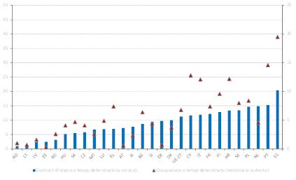 Contratti a tempo determinato in percentuale dell'occupazione totale (fascia di età 15-64 anni) nel 2020 - Lavoro a tempo determinato involontario (fascia di età 15-64 anni) nel 2020, UE-27