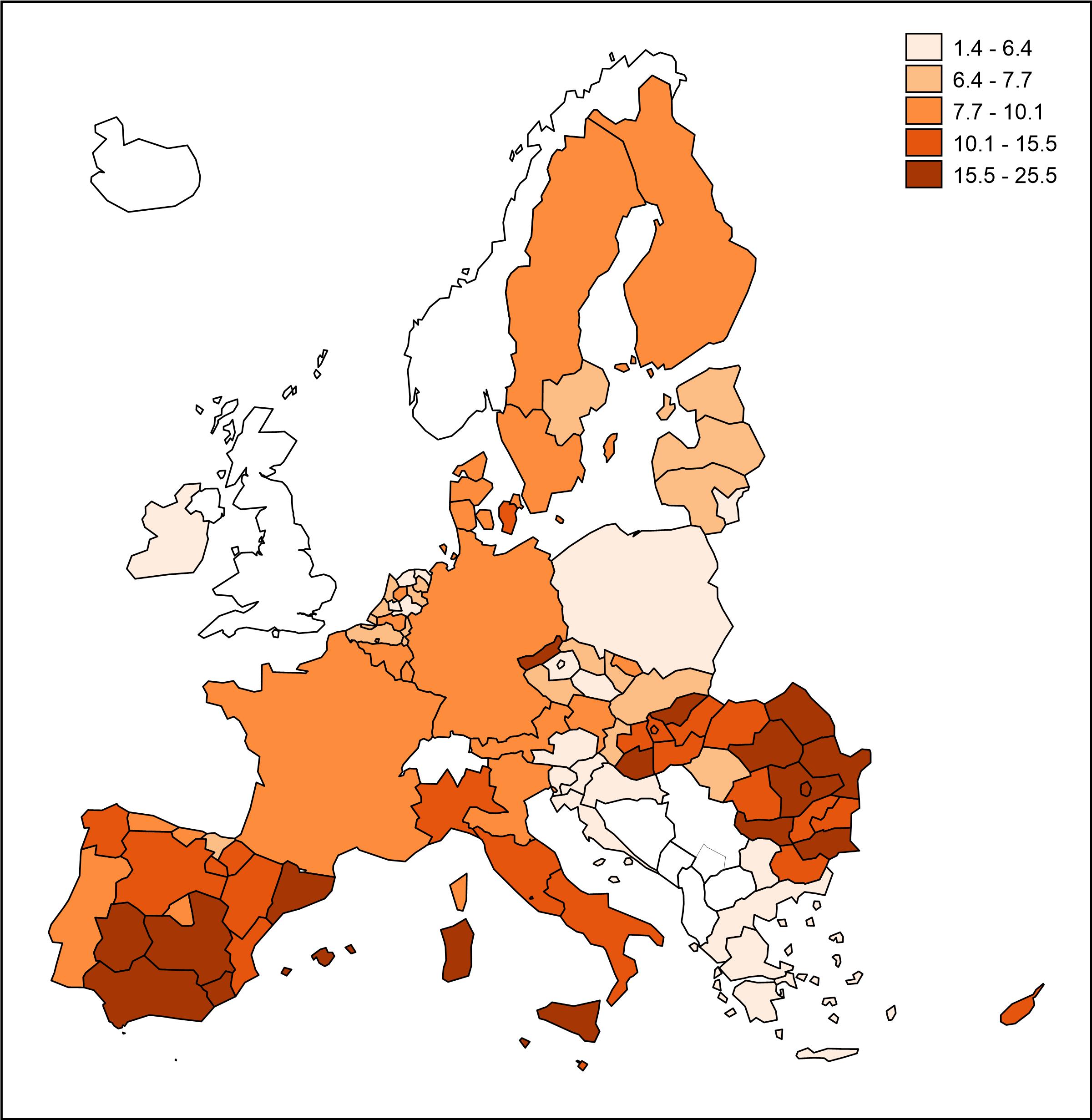 Nota: dati disaggregati a livello regionale (NUTS 2). Se i dati disaggregati a livello regionale (NUTS 2) non sono disponibili, nelle mappe vengono presentati quelli di livello NUTS 1 o nazionale.