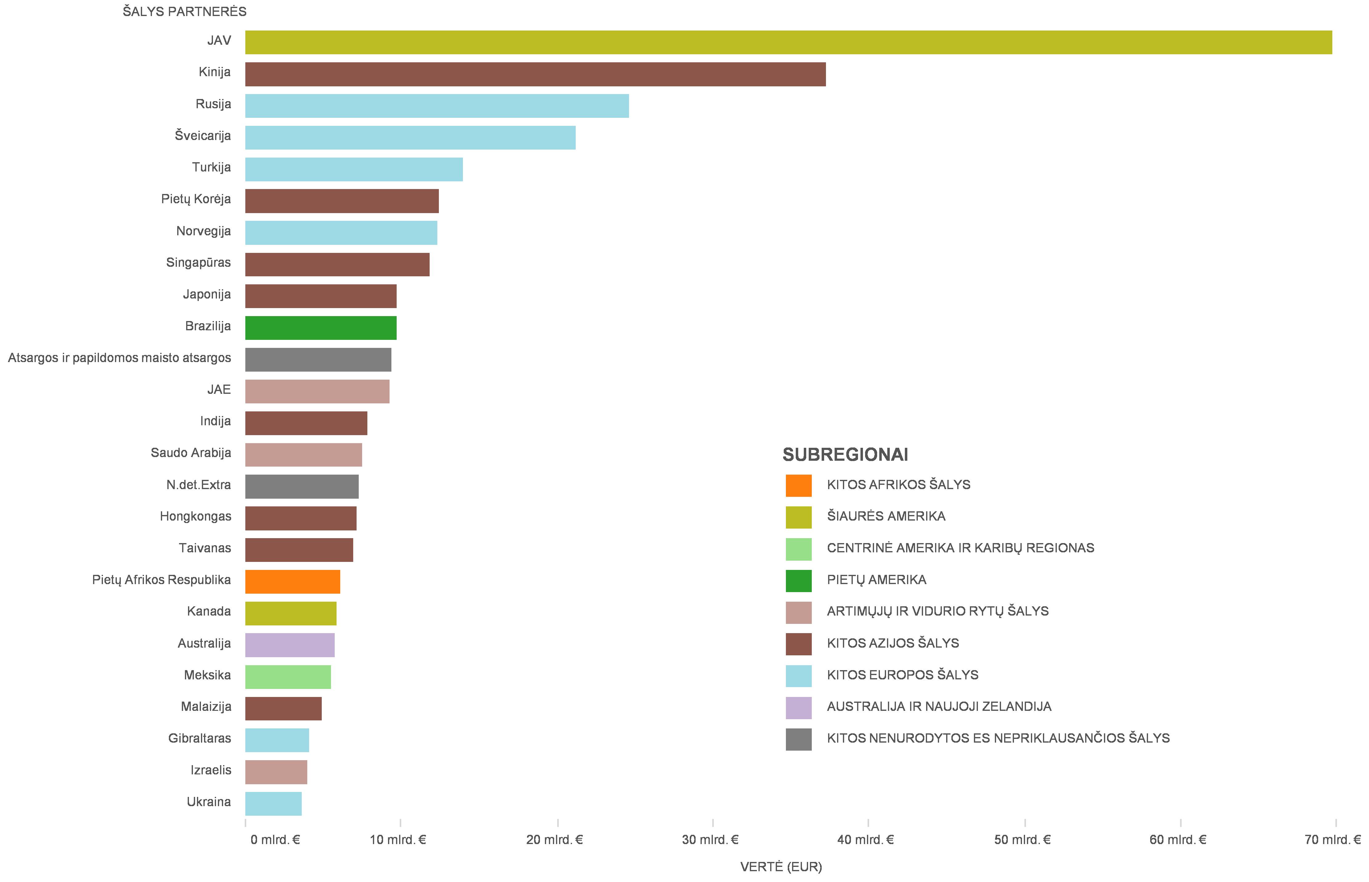 3 pav. ES dvejopo naudojimo prekių eksporto srities paskirties šalys ir subregionai 2013 m.